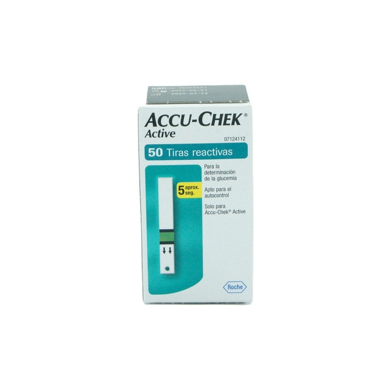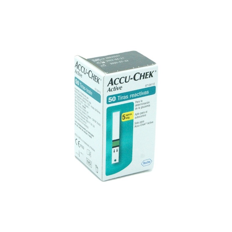 Las tiras reactivas Accu-Chek Active cuentan con comprobación visual de niveles y estado de las tiras a través de bloques de color en la etiqueta. La zona de dosificación tiene una malla protectora verde. Funcionan con el medidor de glucosa Accu-Chek Active