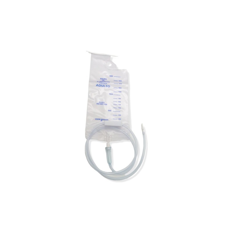 Fabricado en cloruro de polivinilo (pvc), capacidad 1500 ml, consta de bolsa con asa y orificio para colgarse y una abertura con un dispositivo que permita llenarla y obturarla, graduaciones cada 100 ml, cámara y tubo de conexión integrados, con un dispositivo controlador de flujo y obturador y protector del conector.
